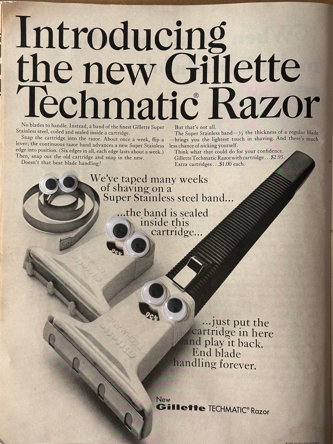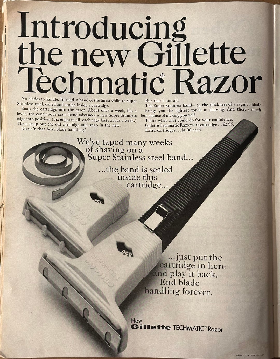 On all accounts, these were terrible shavers, giving crappy shaves at best of times. Surprisingly, Gillette produced them for 20 years, from 1964 to around 1984. There was also a Schick equivalent called Instamatic and the later Autoband.