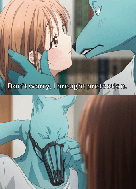 I busted out laughing at that line. I didn’t think it’d go full Horimiya and let it happen, but for him to pull out a muzzle just…hilarious