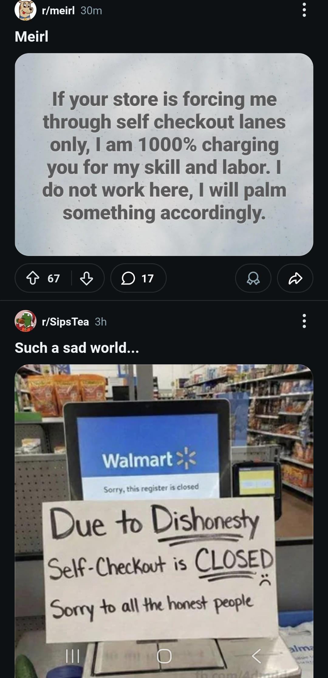 If someone is ‘forced’ to use self-checkout that means they don’t have the option for humans. Which means it can be really, really bad for that person if they get banned from the store. Imagine playing chicken with your groceries with a corpo. They can eat losses a lot longer than a person can.