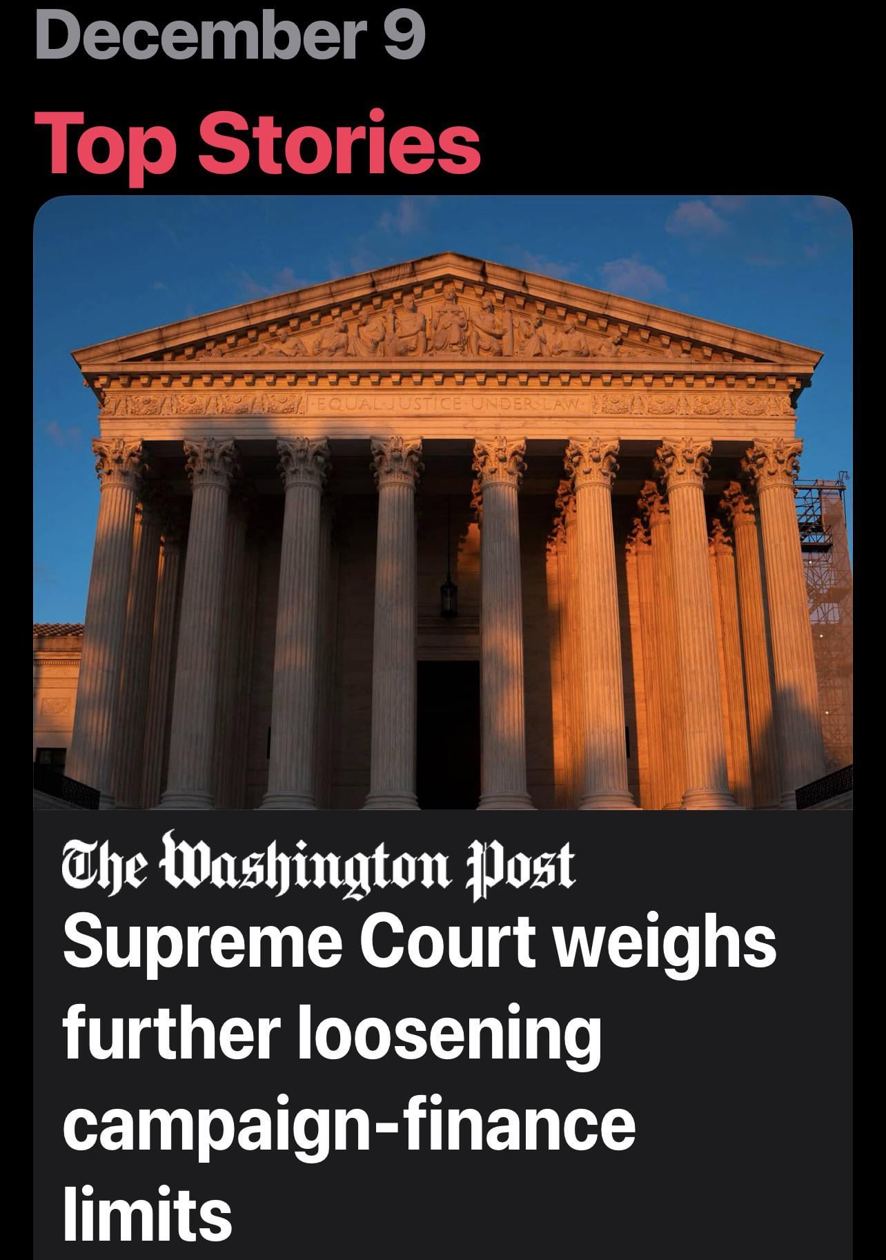 Just when you were thinking, “if only there could be more billionaires influencing politics” the Supreme Court comes to the rescue. Of course they haven’t decided yet so let’s hold our collective breath for a thoughtful and balanced deliberation as we are used to from them.