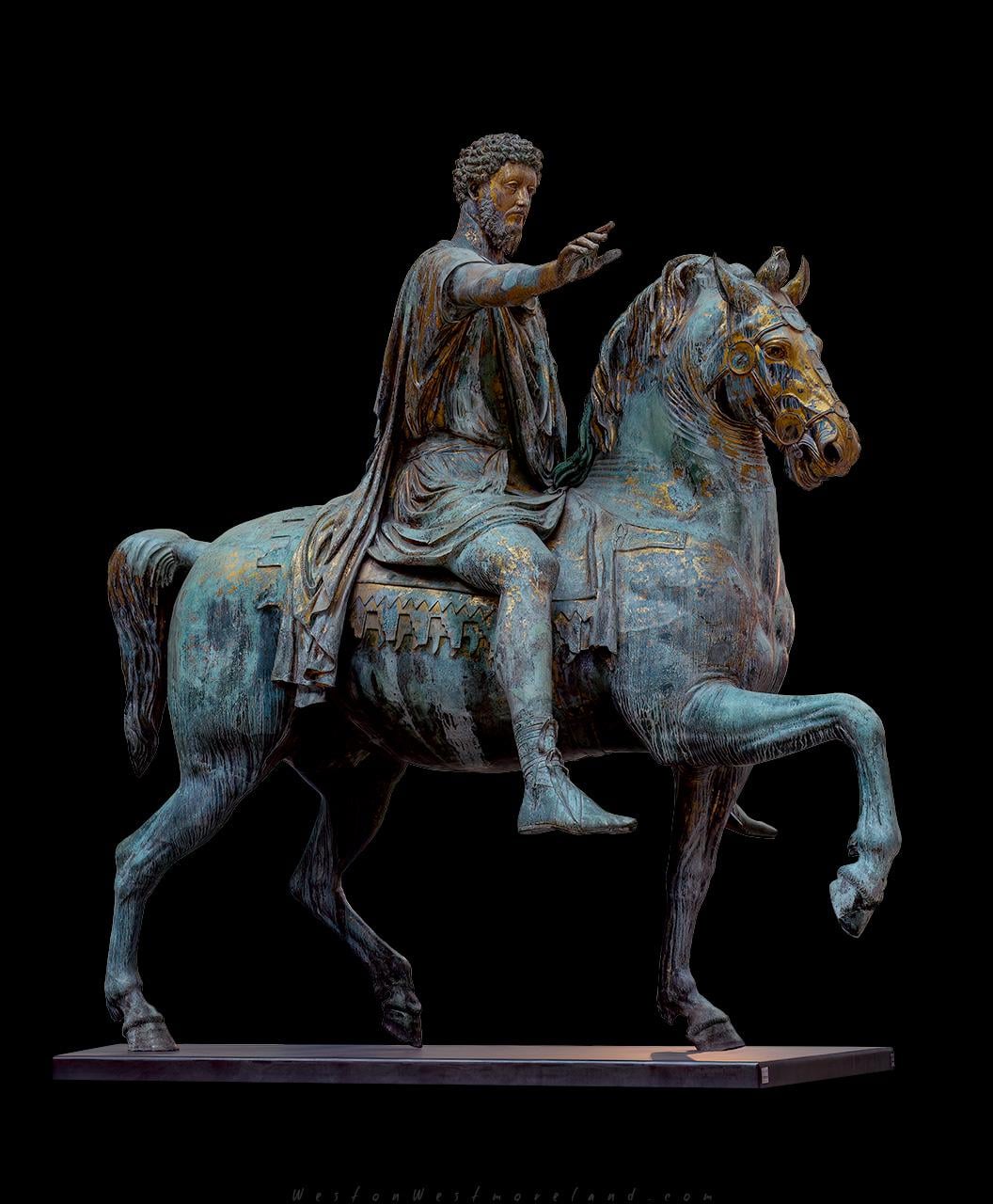 Ah, Marcus Aurelius rides without stirrups, because they had not yet been introduced to the Western world. They would reach Europe from China in the middle ages and make possible the era of knights in shining armor…