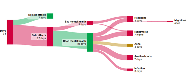 I added a Sankey diagram and an excel overview of the daily experienced side effects. Only side effects clearly caused by the contraceptive were taken into account. (The infection seems to be caused by the delayed period; it's a recurring issue that I haven't had for over 2 years).