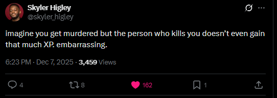 Your whole life amounts to a Player Character inspe ting your body and seeing “Corpse (Empty” on the HUD lmao