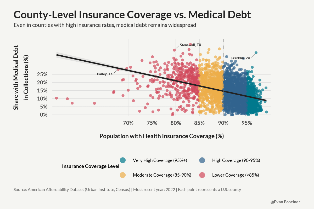– Very High Coverage (95%+ insured): 9.3% average with medical debt
