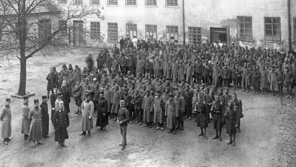Austro-Hungarian soldiers guarding Turkish soldiers in Reichenberg in Bohemia, 1912. The Turkish troops crossed the border into Austria-Hungary during the First Balkan War. [1019 x 577]