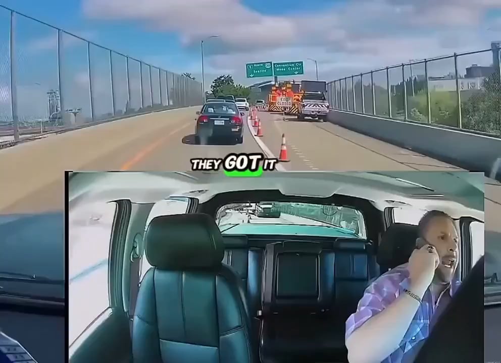 Dumb ass thought he was busting through road construction but was going around a parade barricade and had to just follow through with it 😂