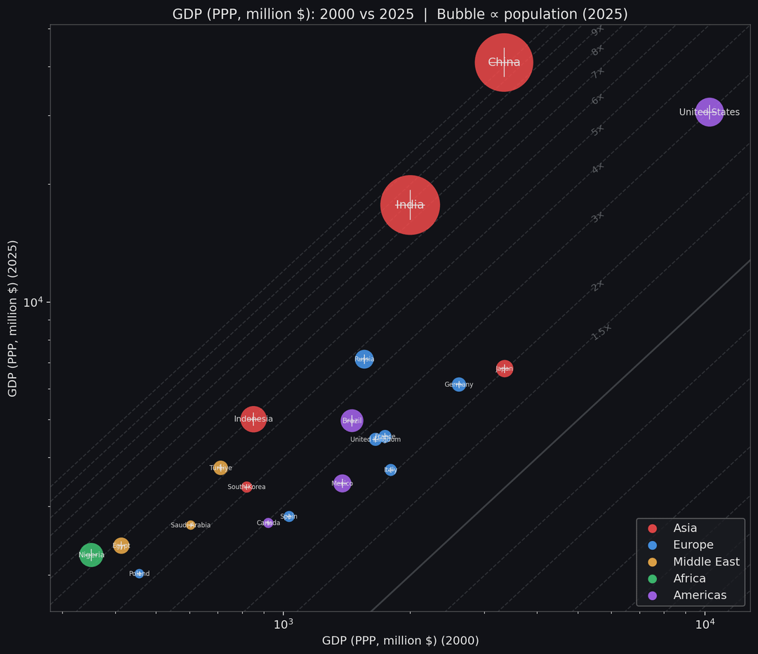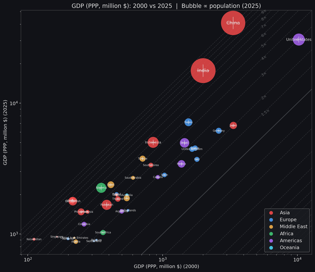 GDP in purchasing power parity (PPP) for ~200 countries, comparing 2000 (x-axis) vs 2025 (y-axis) on a log–log scale. Each point is a country; circle area is proportional to its 2025 population, colors show region (Asia, Europe, Middle East, Africa, Americas, Oceania).