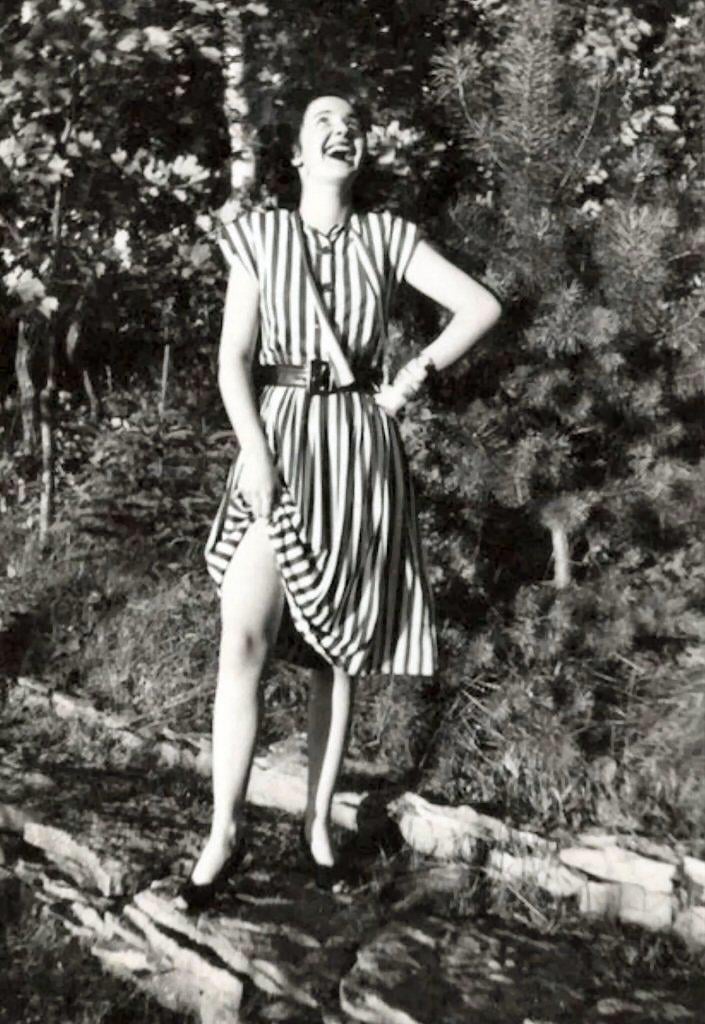 This 1940s lady with an exuberance laugh is showing the photographer a little bit of her thigh.
