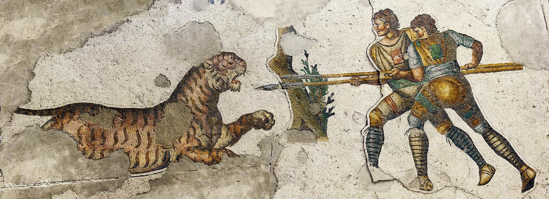 Mosaic of two Venatores facing a tiger. Peristyle court, Palatium Magnum, Constantinople, 531-602 AD, Roman Empire. Possibly from the times of Justinian I builder of Hagia Sophia, this mosaic can be admired at its original location on the court that Justinian himself might have trod… [1920×1080][OC]