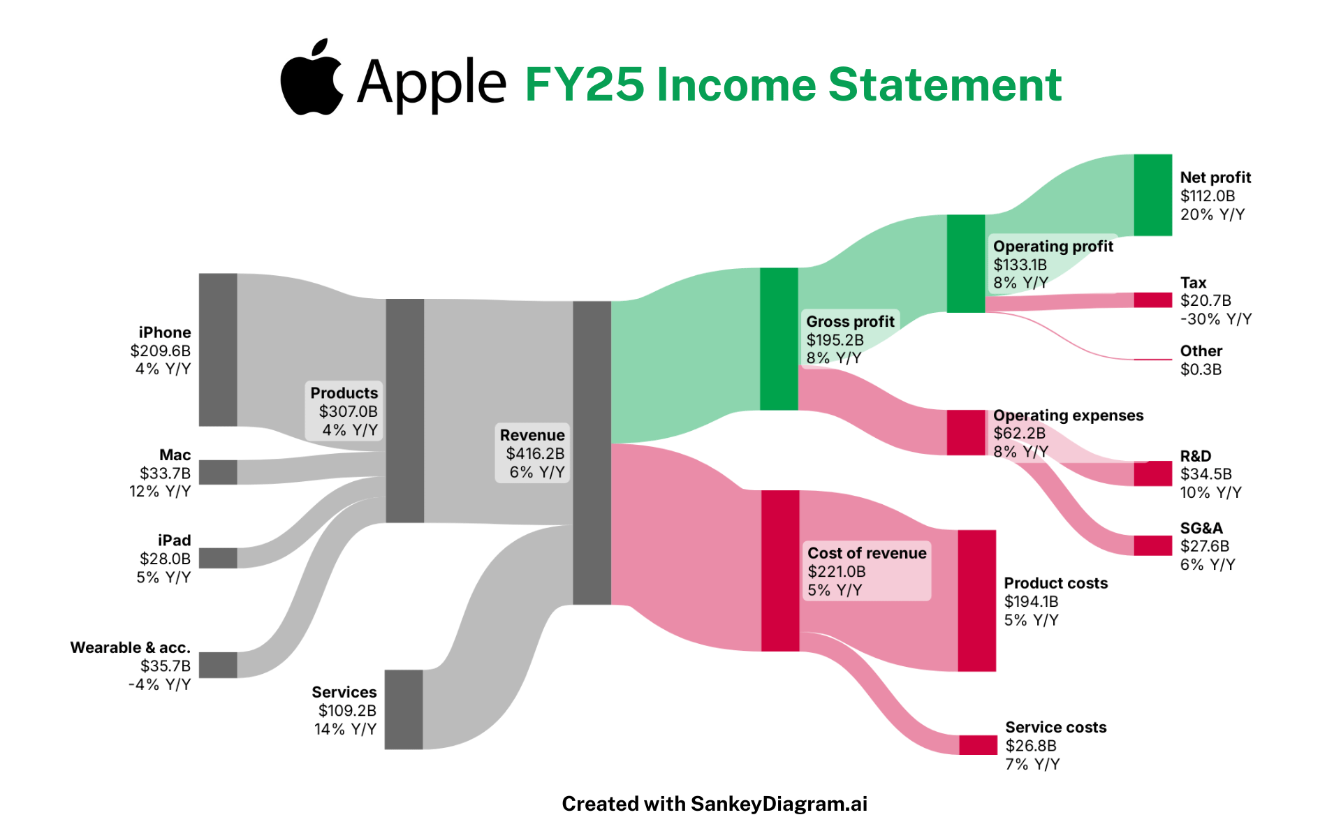 This Sankey diagram visualizes Apple’s FY25 income statement, showing how the company generated $416.2B in total revenue and ultimately produced $112.0B in net profit.