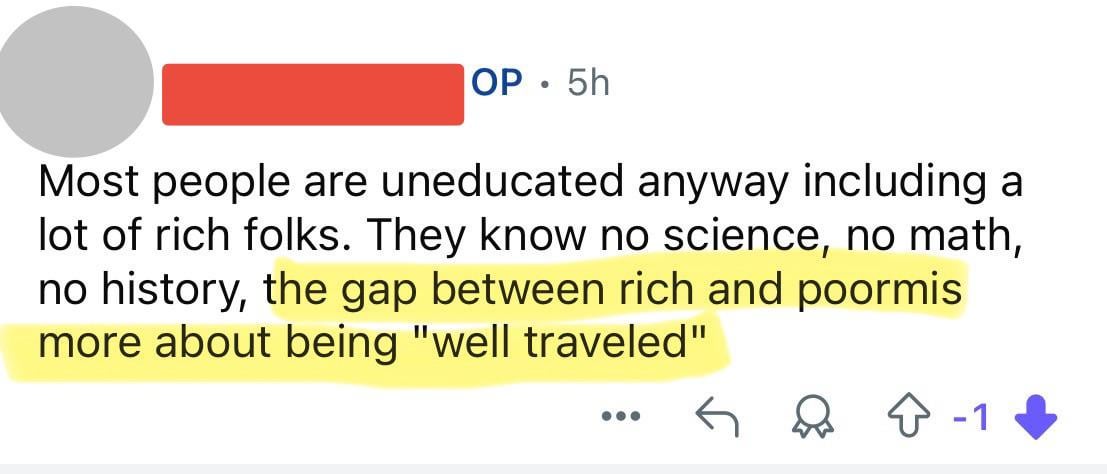 Rich people being ignorant doesn’t affect their lives, they can travel wherever they want because they have the resources. Poor people need to get educated to get better jobs that allow them to travel.