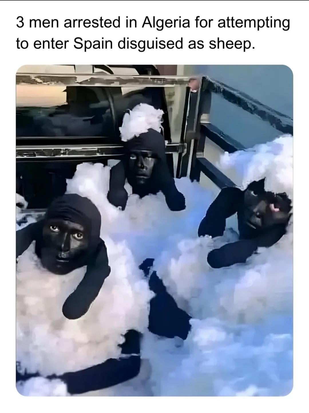 jeezarchristron on December 12, 2025 4:21 pm https://preview.redd.it/oxfm0fbxts6g1.png?width=1080&format=png&auto=webp&s=d80907466953d6fe8c5092debc5371e89d6a831e Just in, 3 men arrested in France attempting to enter Germany dressed as monkeys.
