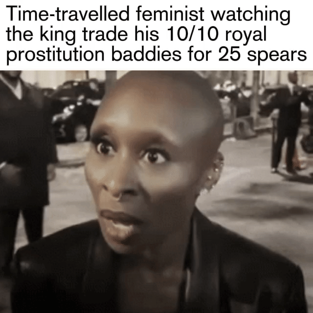 For some more context, Spears were like one of the cheapest and easiest to make weapons in ancient times. Ofc, depends on what kinds of spears but generally they were cheaper than swords, armors or any other weapons so yea, the meme here suggested that women were that cheap
