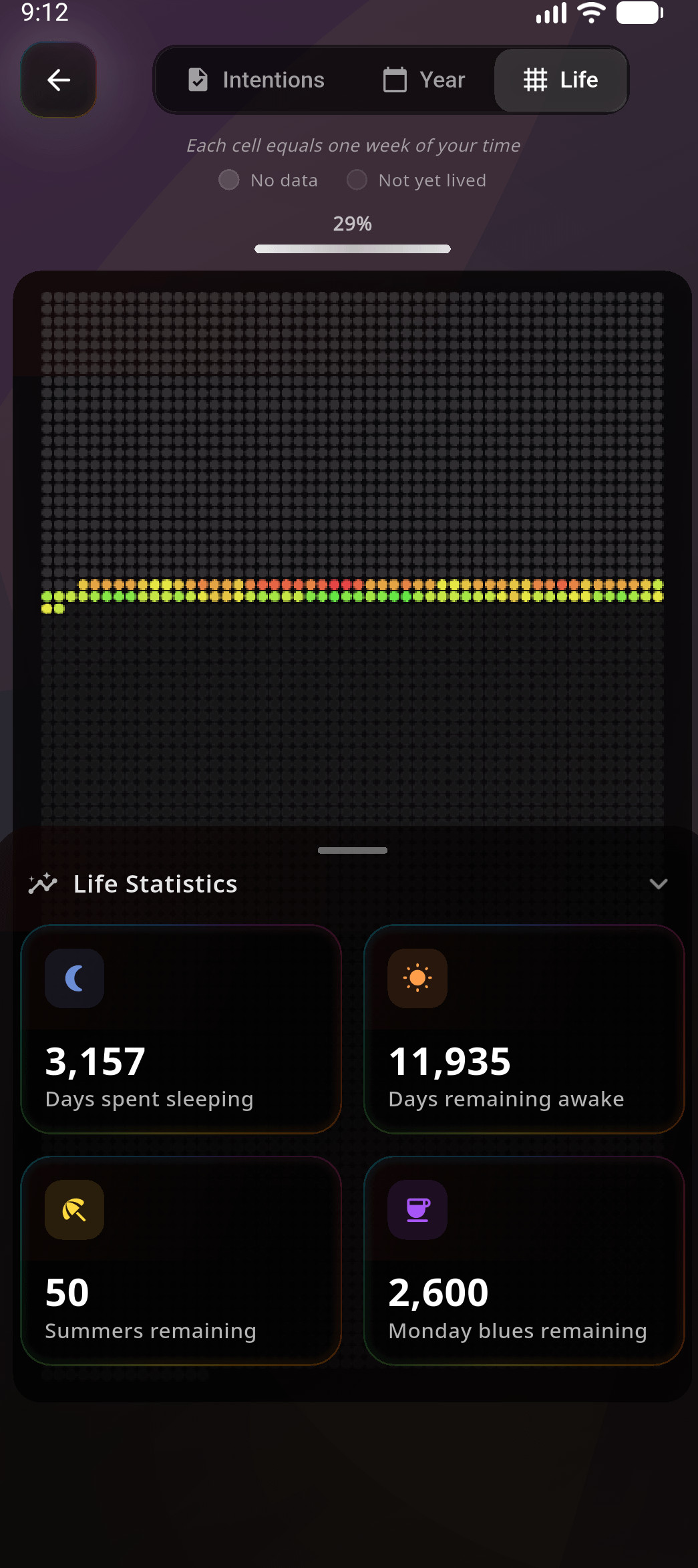 I used to put everything off. Turns out seeing time differently helped. Im not suddenly disciplined or productive.I just stopped telling myself “I’ll do it later” so easily. Seeing time laid out made me realize how often I was postponing things for no real reason, especially on days I already disliked, like Mondays. I still rest. I still sleep. I just don’t drift through days as much. That's my life folks, every dot is a one week of my time. This things sends me a notification, i go in, rate my day, answer some random yes no questions about my day, set intentions once a day and that's it. 2 years of my life is here. Posting in case this clicks for someone else too.