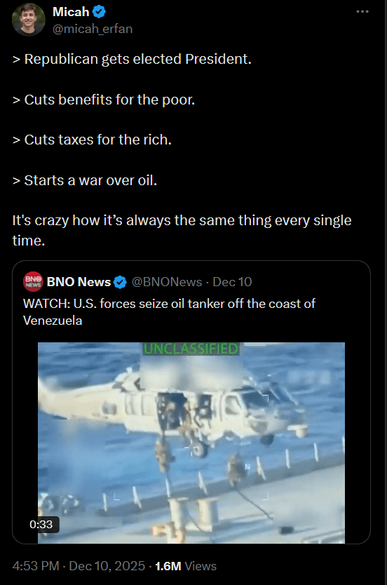 [https://www.politico.com/news/2025/12/10/us-seizes-venezuelan-oil-tanker-00685289](https://www.politico.com/news/2025/12/10/us-seizes-venezuelan-oil-tanker-00685289)
