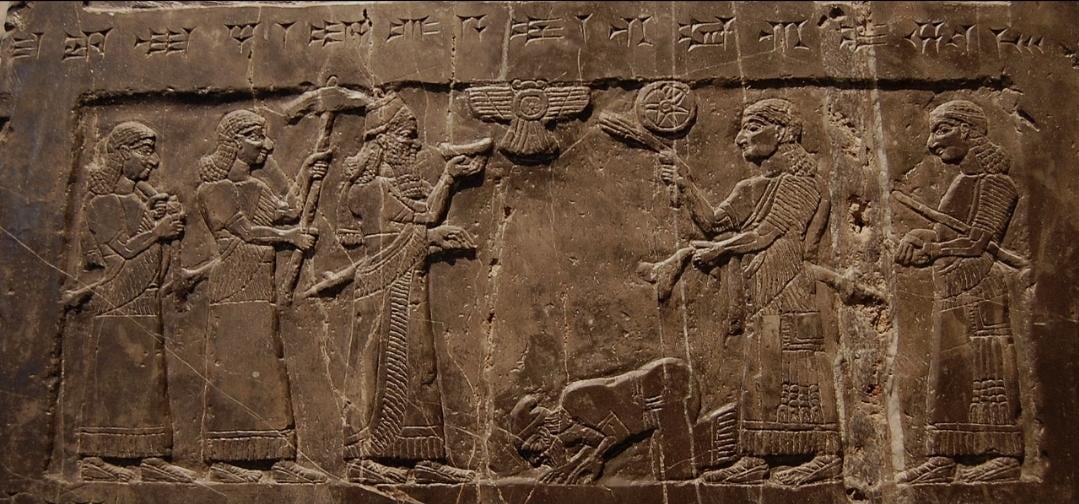 King Jehu of Israel bows before the King of Assyria, relief scene from the Black Obelisk of Shalmaneser III, ca 827–824 BC. [504×1079]