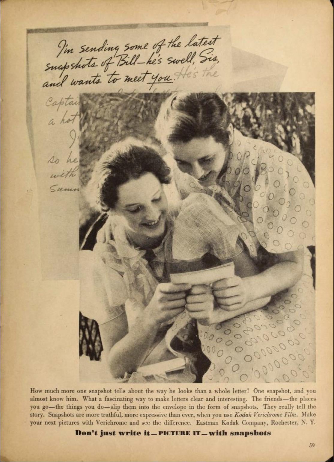 How much more one snapshot tells about the way he looks than a whole letter! One snapshot, and you almost know him. What a fascinating way to make letters clear and interesting. The friends—the places you go—the things you do-slip them into the envelope in the form of snapshots. They really tell the story. Snapshots are more truthful, more expressive than ever, when you use Kodak Verichrome Film. Make your next pictures with Verichrome and see the difference. Eastman Kodak Company, Rochester, N. Y.