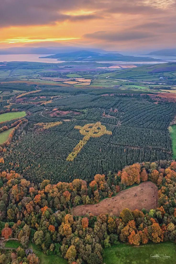 Every autumn, a huge golden cross appears in the forests of County Donegal, Ireland. 3000 Japanese larch trees were planted among pine trees, creating a cross pattern when the larch trees turn yellow.
