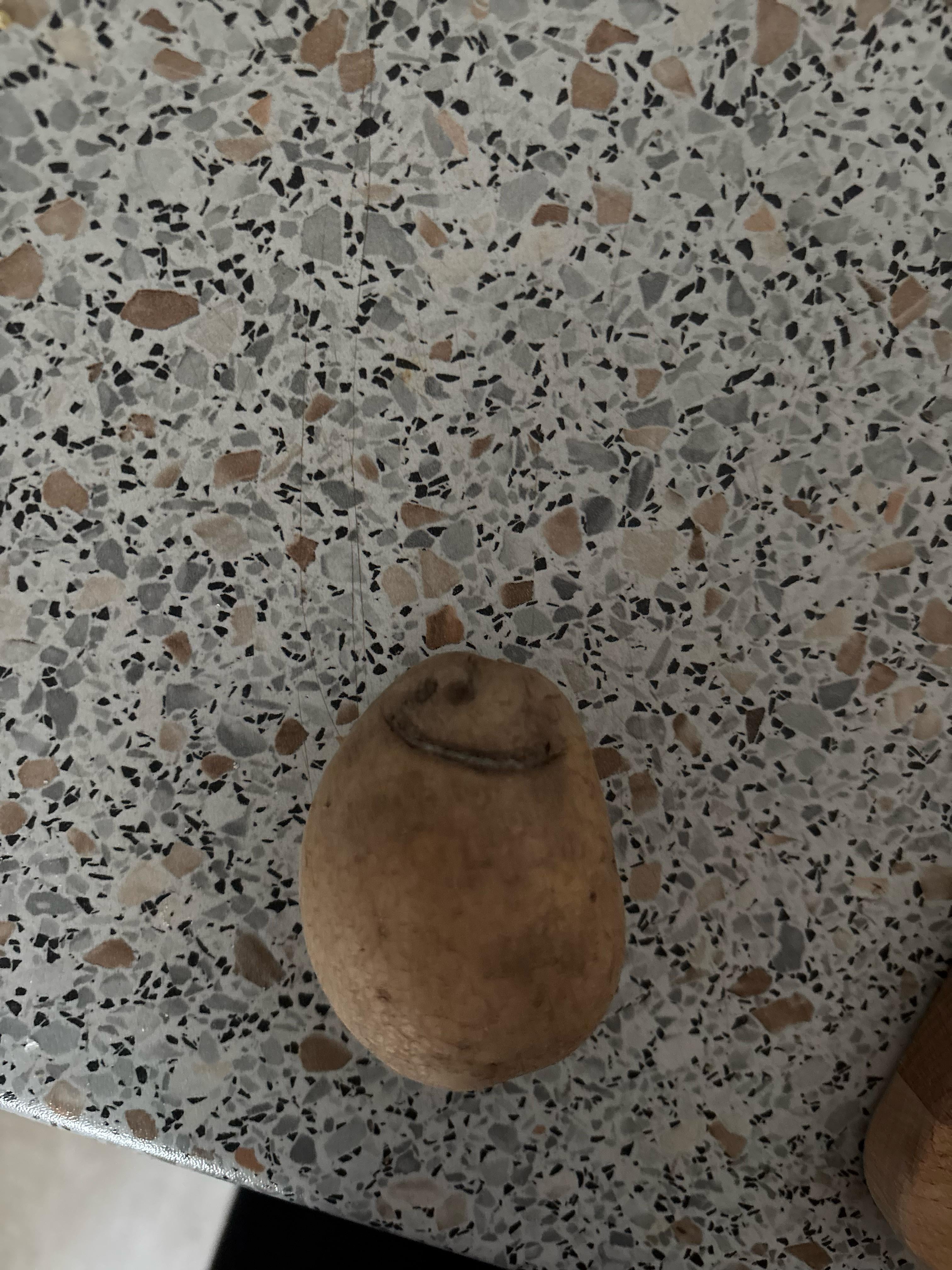 We once had a french fry at a summer camp I was at and the girl who found it saw a little sad face on it. We called him Sad Fry and I think this is his dad.