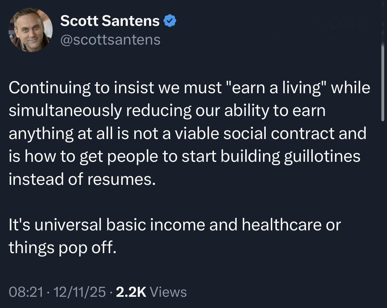 “It’s universal basic income and healthcare or things pop off.”