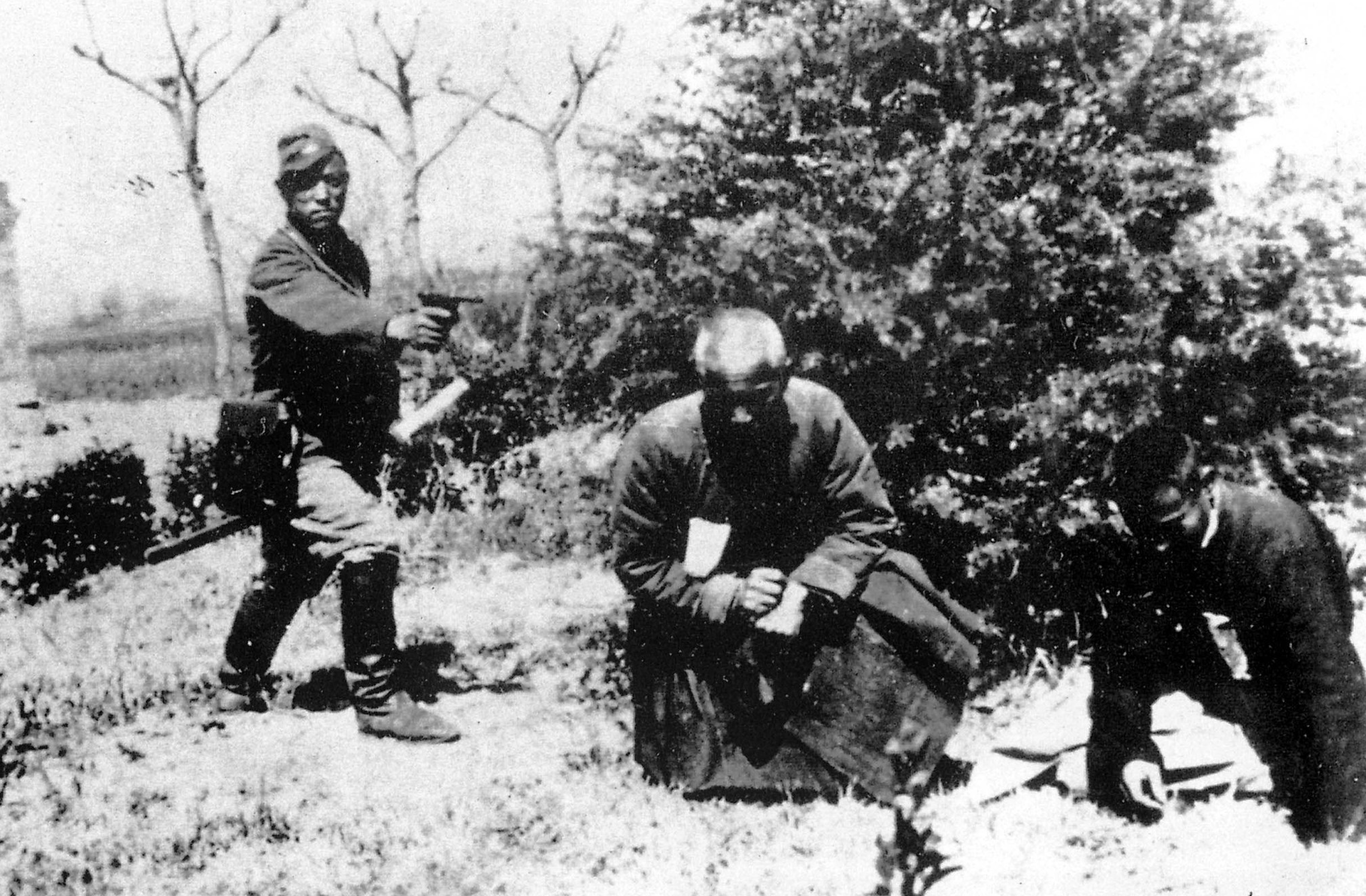 AJapanese officer prepares to shoot a Buddhist monk and a local farmer. Photographed during the infamous four-month massacre, Nanjing, December 1937. [2607×1711]