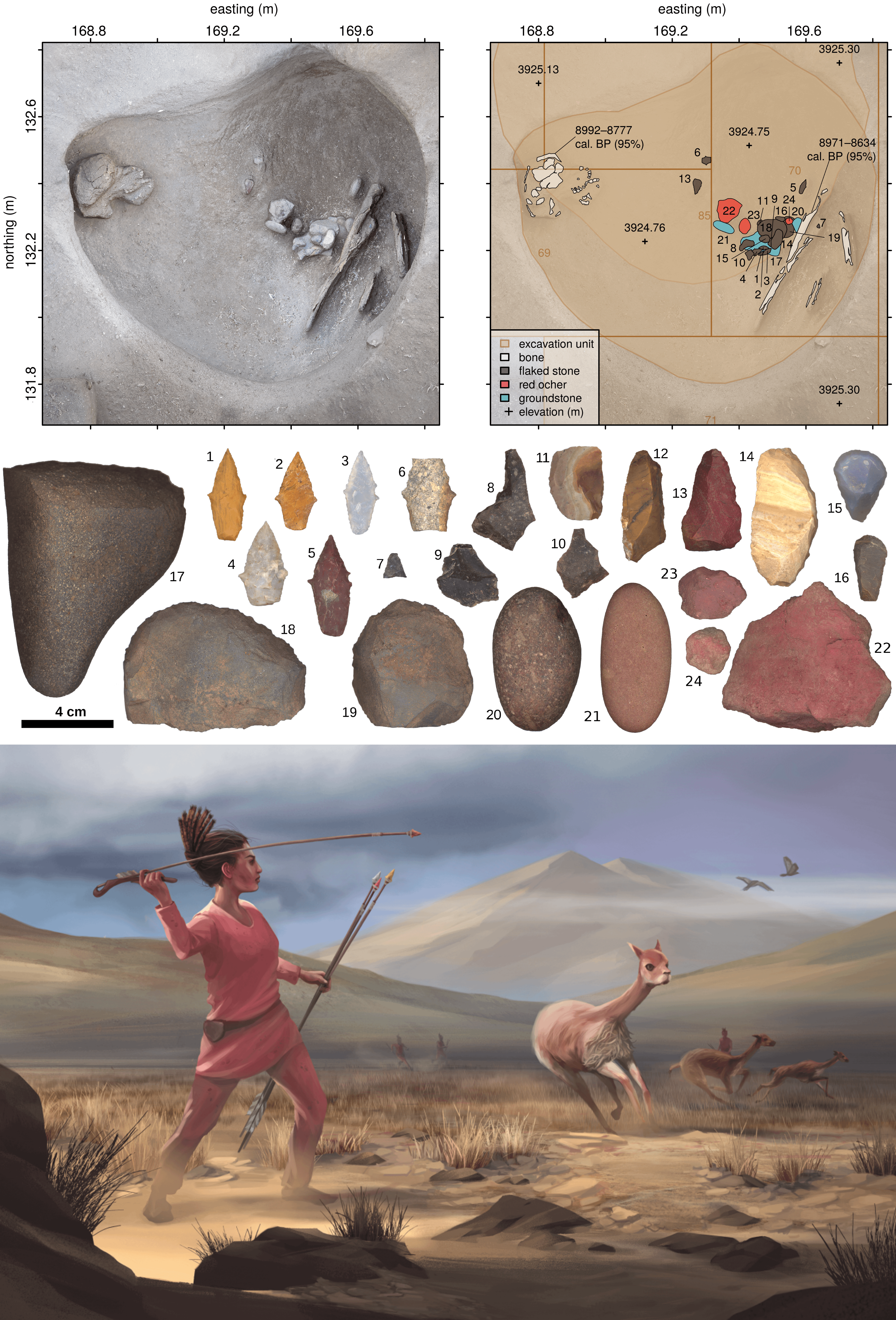 The grave of Warawara, a young-adult female ceremoniously interred with a hunting toolkit 9,000 years ago at the site of Wilamaya Patjxa in Peru. The bottom picture is a reconstruction based on archaeological findings, rock art, and other archaeological evidence from the region [3504×5160]