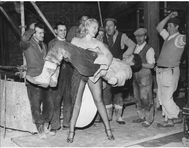 Workers look in amazement as glamorous strong women Joan Rhodes demonstrates her strength by lifting one of their coworkers, this was a time when women had to be as “ladylike” as possible, London 1958.