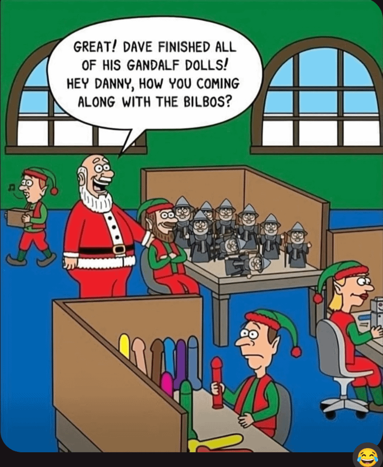 This would be so much funnier if it had just the elf’s “oh fuck…” eyes showing instead of this “joke for dummies” version.