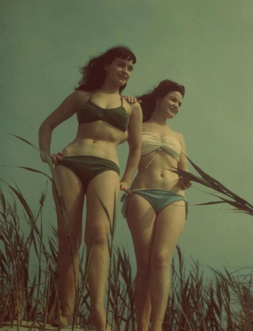 ‘Queen of Pinups’ Bettie Page, and her sister Goldie. Photograph hand-colored by Goldie, 1950s