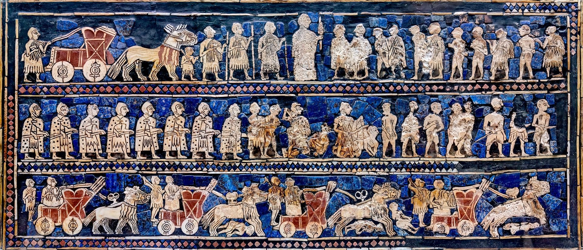 The bottom tier shows four war wagons, each carrying a driver and a warrior (carrying either a spear or an axe) and drawn by a team of four equids (possibly onagers or domestic asses since horses were only introduced in the 2nd millennium BC after being imported from Central Asia).