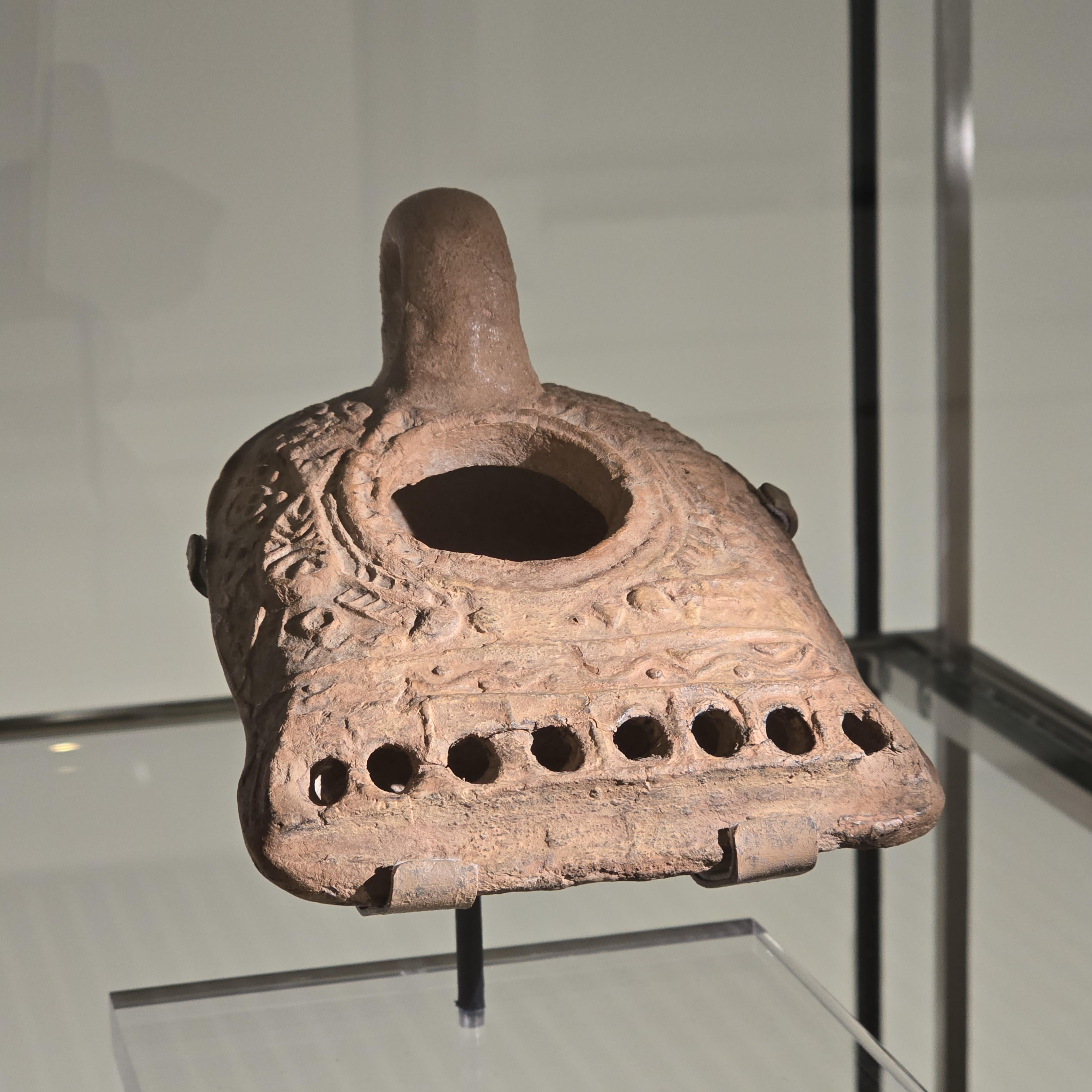 In the year 70 CE the Roman Empire conquered Jerusalem, destroying the second Jewish Temple and solidifying a period of Roman rule that lasted more than seven centuries. Jewish communities continued to live in the region and gradually incorporated aspects of Roman material culture in their daily lives, including lamps like this one. This ancient lamp, with its eight wick sockets, is an unusual early version that may align with the Hanukkah custom of kindling eight lights. The now-standard Hanukkah lamp with eight lights plus a shamash (helper light), however, did not appear until the Middle Ages. Lamps like this one were likely used for daily illumination and holiday]