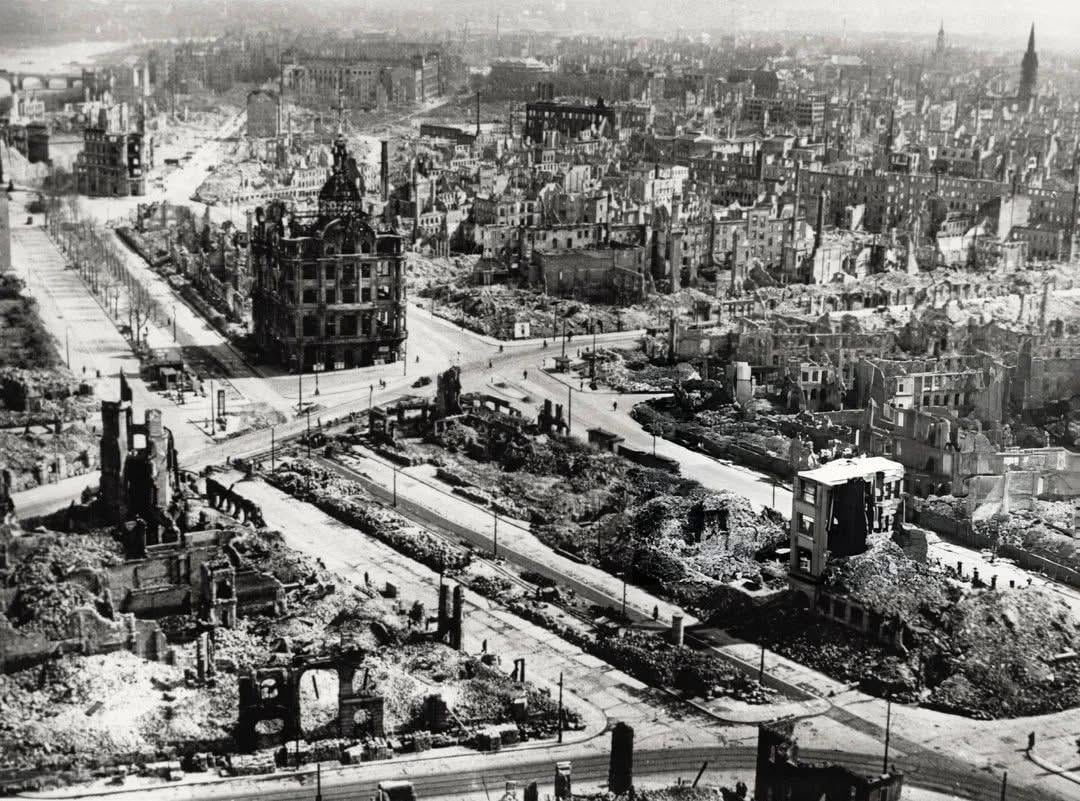 Aerial view of Dresden, Germany around Pirnaischer Platz, devastated by British and American incendiary bombing on the 13th and 14th of February 1945. The bombing and the resulting firestorm destroyed more than 1,600 acres of the city; and up to 25,000 people were killed. [1080×881]