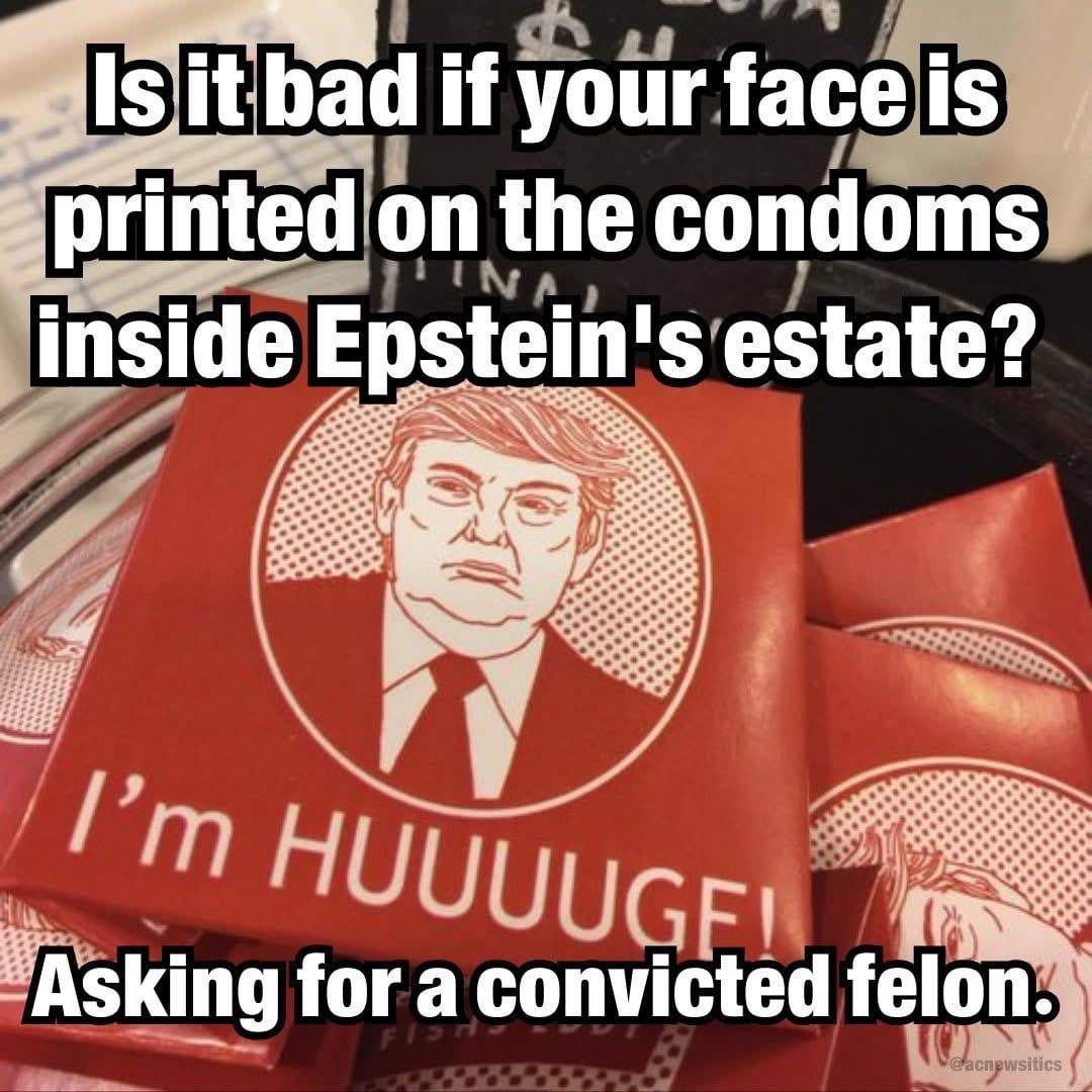 People really need to stop and think about this picture for a minute. Jeffrey Epstein literally collected famous and influential people for a living. Movers and shakers from all walks of life. But as far as we know he never had spoof condoms made bearing the likeness of Bill Clinton… or Bill Gates, Woody Allen, Prince Andrew, Alan Dershowitz, Larry Summers, Steve Bannon etc. etc. What exactly was it about the nature of Epstein’s relationship with Trump that made this sort of bawdy humor acceptable?