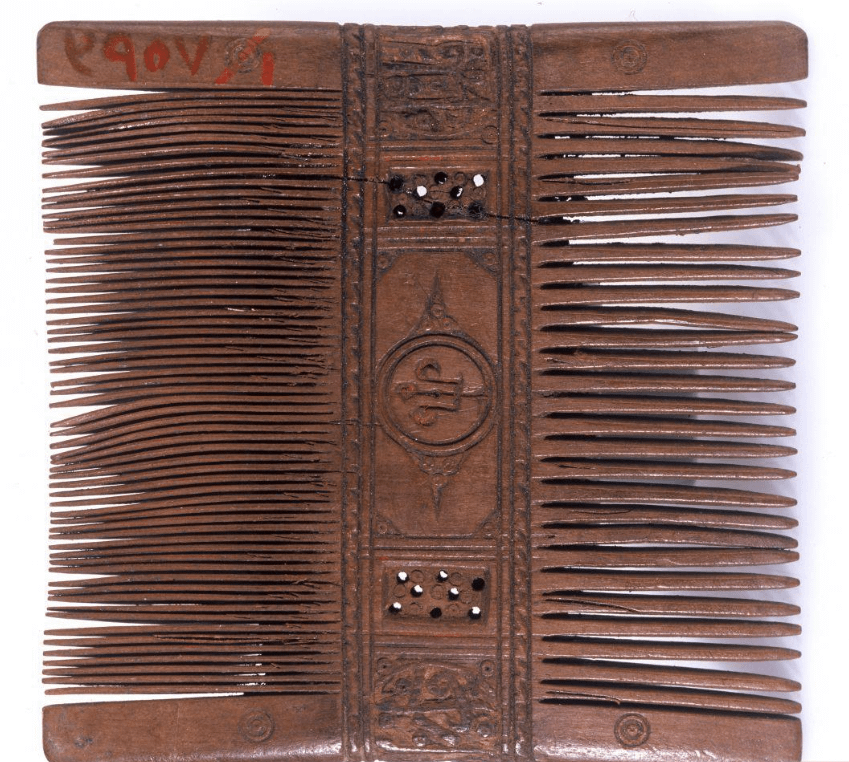 The embellishment in the center, which includes a 'fleur-de-lys', was created using a stamping device. An inscription says: 'Eternal Glory and Prosperity'. These sort of inscriptions were common. Another Egyptian comb from this period contains the inscription: 'I am a comb made to comb none but the beautiful.'