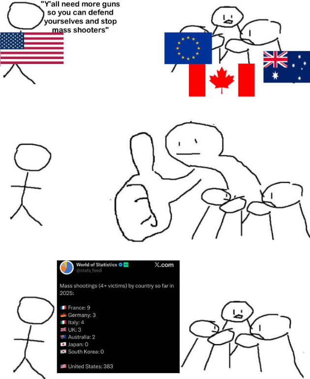 I love the poor counter of, “well if guns are illegal in those countries, how did they get a gun?”. Multiple mass shootings in the US on the monthly versus one mass shooting in decades.