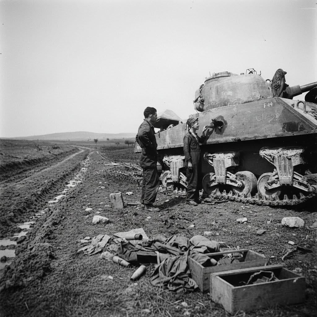 GIs checking out the exit hole on an 8th Armored Division Sherman tank, 1944 [796×513] by UrbanAchievers6371