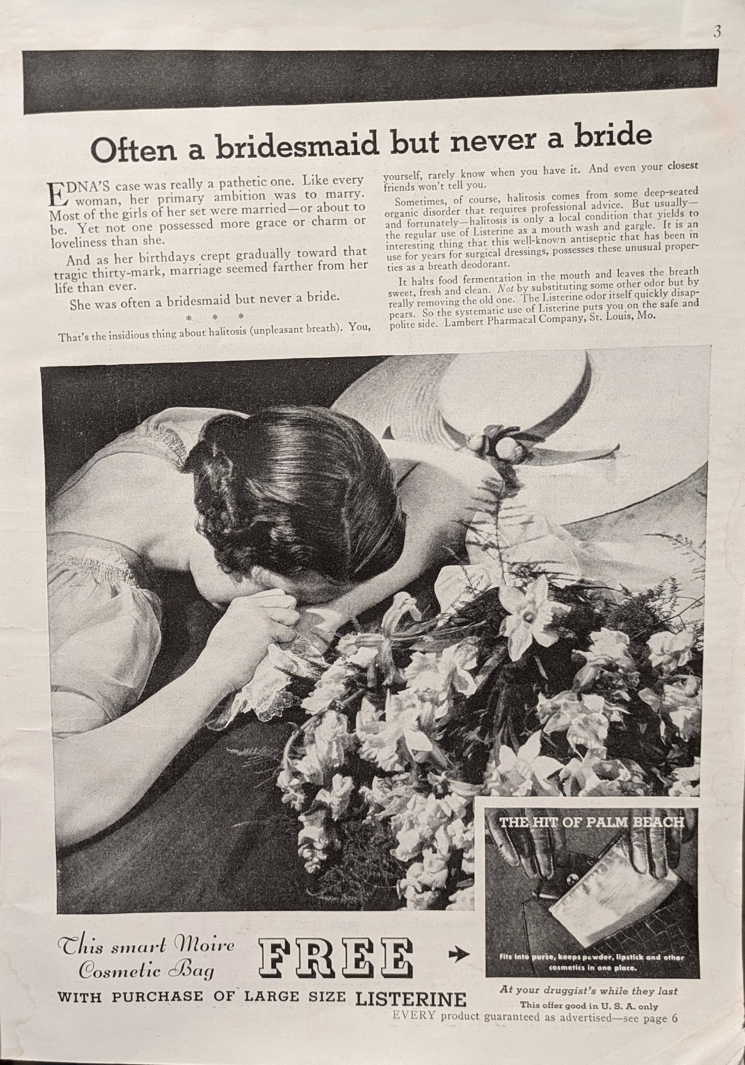 "Often a bridesmaid but never the bride". Listerine ad printed as page 3 of Good Housekeeping, May 1936 edition. by MentallyCrumbled