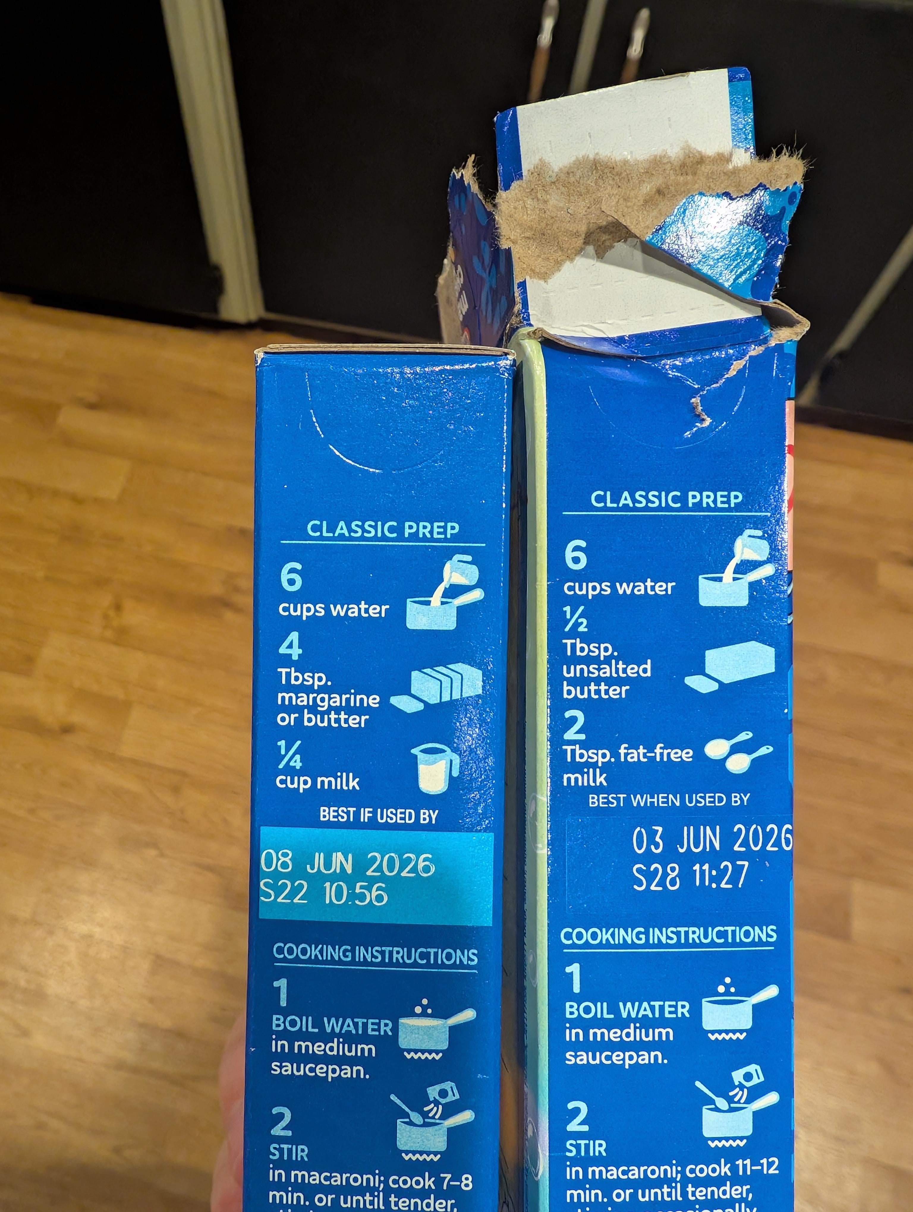 For the longest time the shape mac and cheese boxes had the skim milk and one pat of butter instruction shown here but had a little note in small print that for a richer taste, use 2 more tbsp of butter