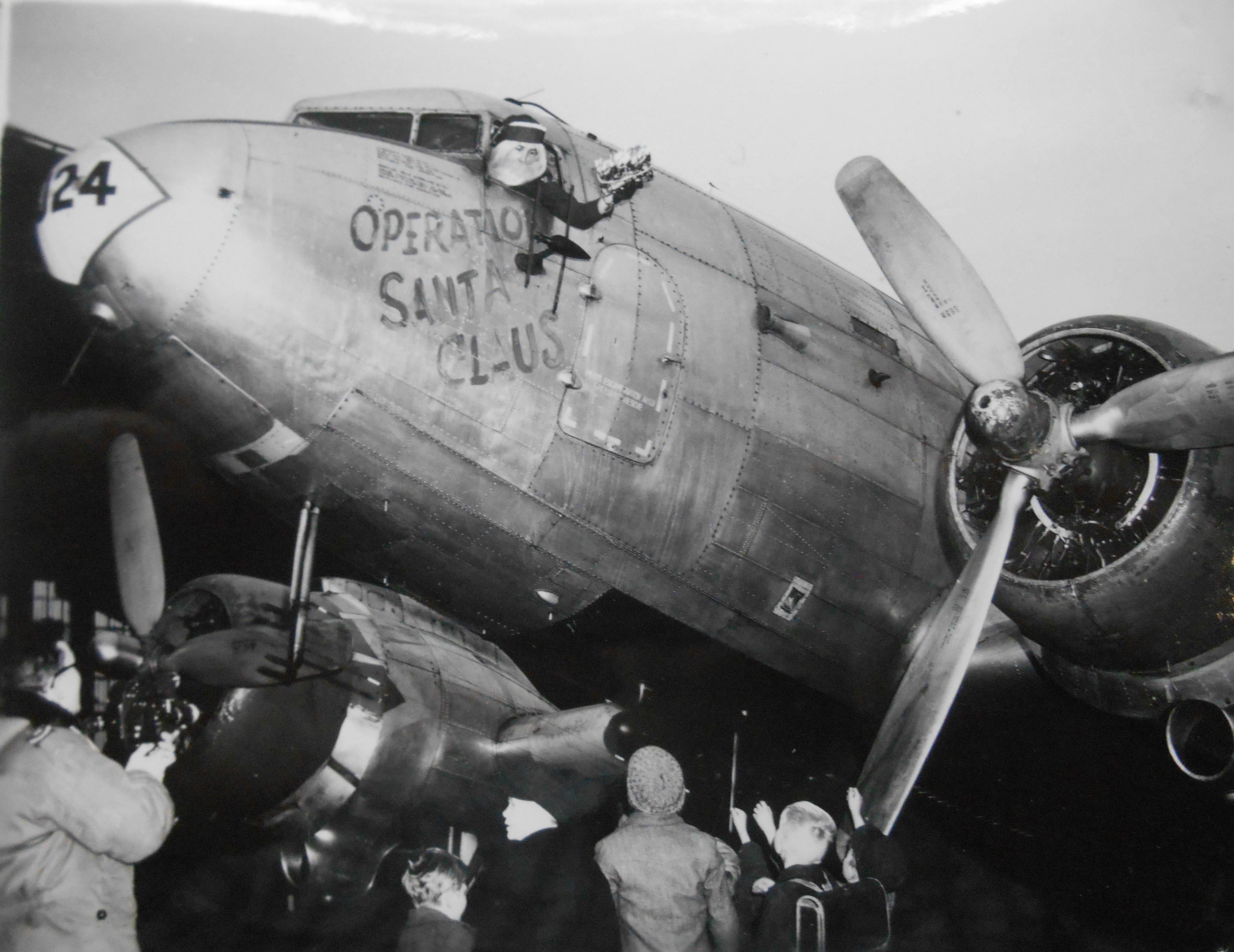 A pilot dressed as Santa Claus distributes gifts from his plane after landing in Tempelhof. December 1948. (3985×3076) by princeofpirate