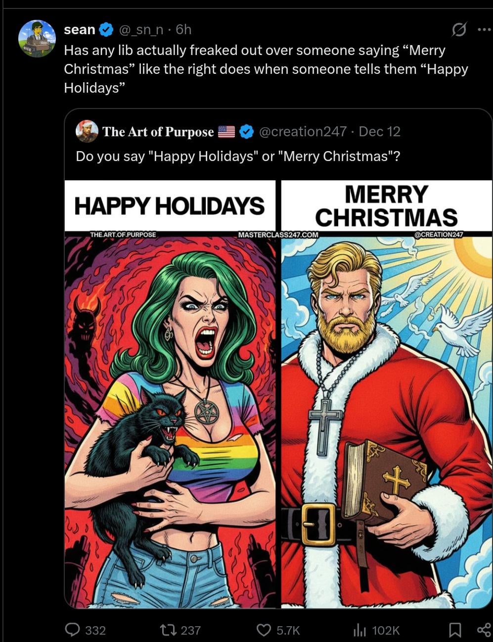 5. Liberal atheist here. Can confirm never freaking out over someone saying “Merry Christmas” ever. Just do my thing, no bad vibes