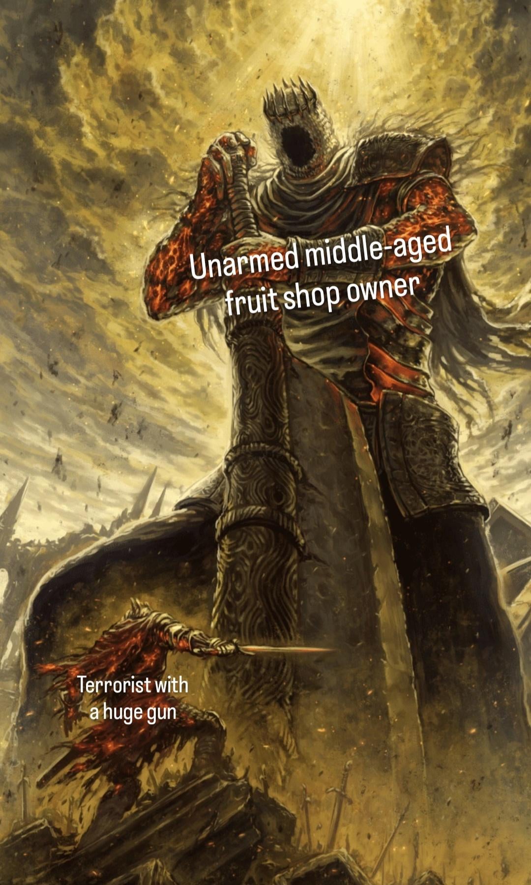 once more since i lack context of what the meme is talking about. i have no idea if op is using the templete correctly or not and have to assume a terrorist with a huge gun killed everyone.