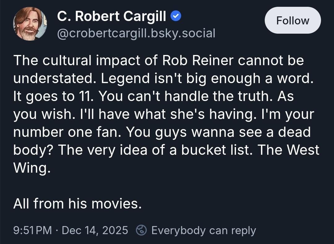 While not everything Rob Reiner did was great (North, his whole cringy anti-smoking campaign where he used kids), words cannot describe how angry and saddened I am that something so evil could happen to a man so otherwise talented and entertaining. Being murdered by your own family is sick.