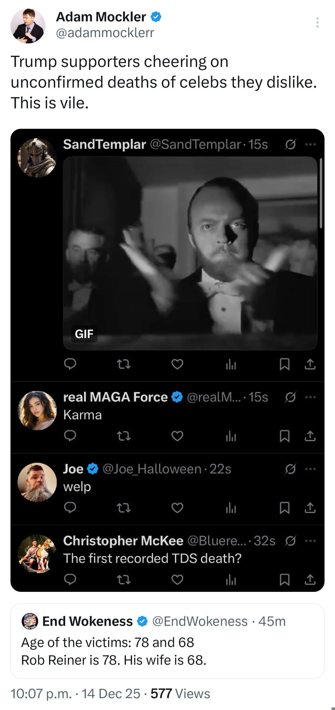 Oh god. We’re really doing this. I didn’t celebrate Charlie Kirk’s death. Don’t you dare throw a parade for Rob!