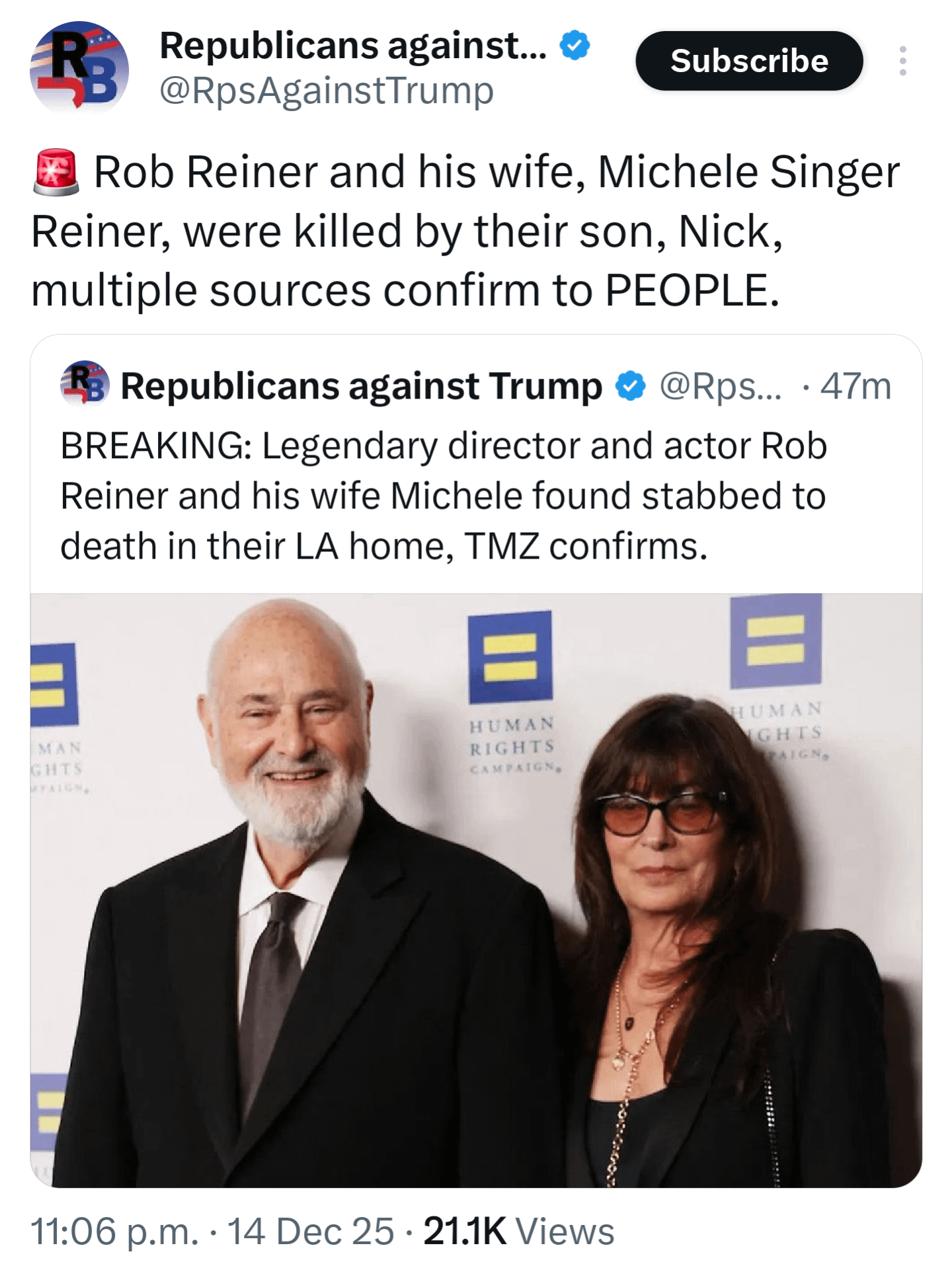 Bold for them to come out and say it was the son so early in the investigation. I read in CNN that they were discovered by a family member, and that the son (idk which one) was escorted away by police. And the Rob’s daughter lives across the street from her parents. Horrible.
