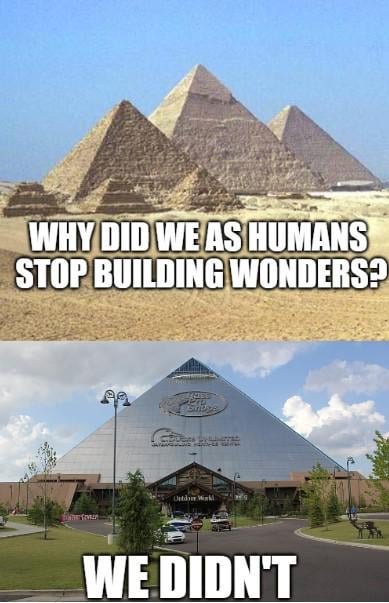 4. It’s not about the shape it’s about the meaning. The egyptian pyramids are giant tombs for god emperors, the bass pro thing is just a symbol of the modern decadence and capitalism that plagues our world.