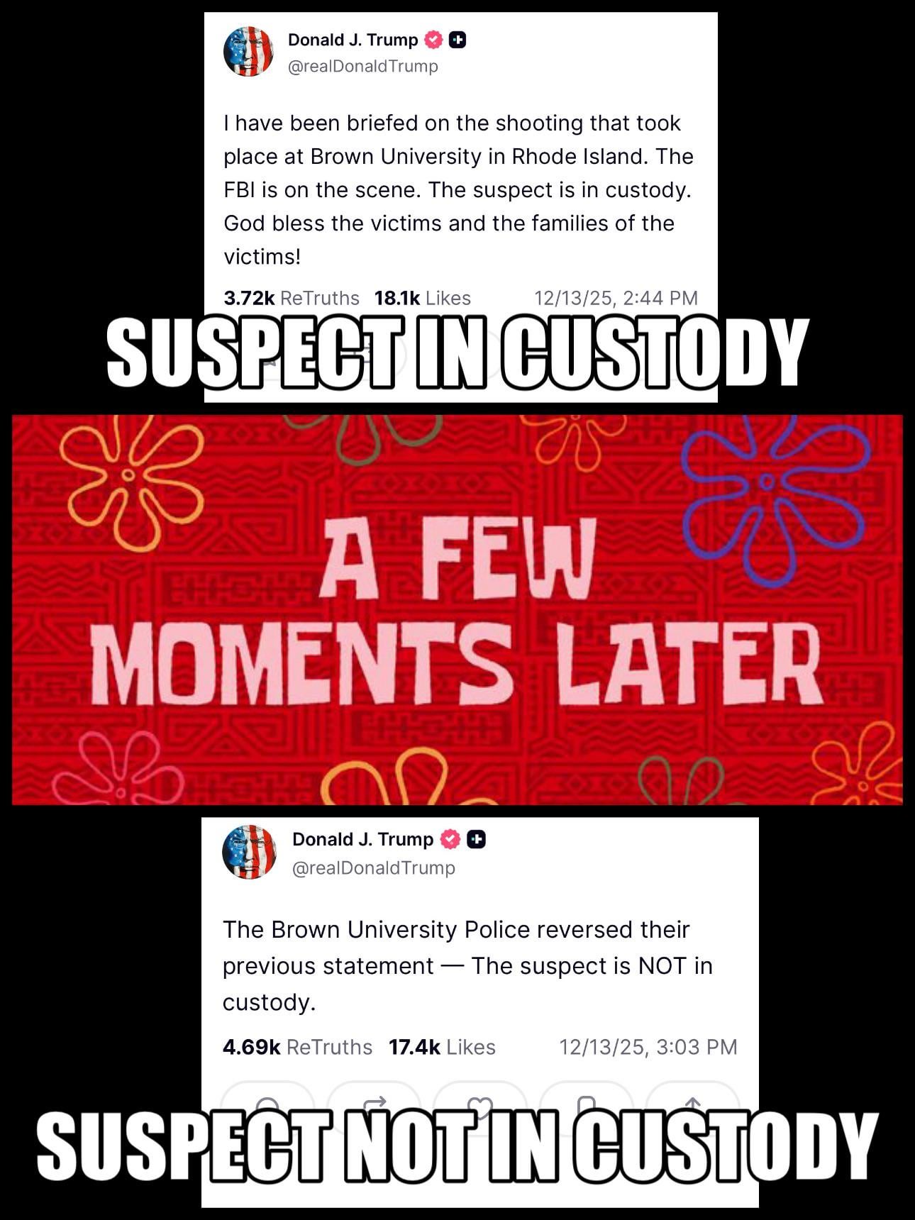 Wasn’t Trump the one that first claimed the suspect was in custody? I don’t recall Brown University making that claim.