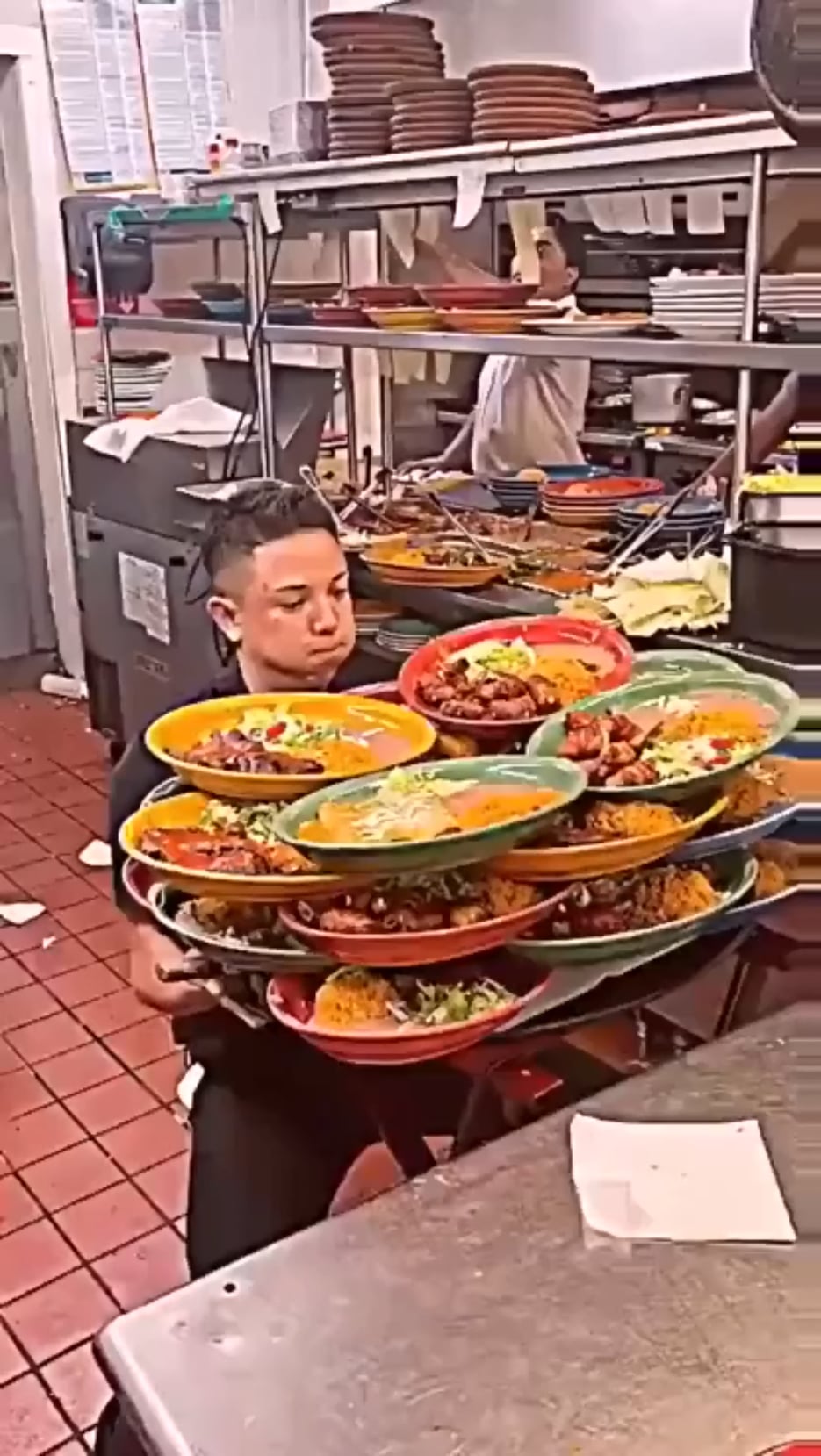 I don’t know man… it’s impressive but I feel like the risk here is so high. You get a viral video out of it, but if you drop that shit the kitchen has to remake like 20 or more meals. Just have more than one server bring it out or make two trips.