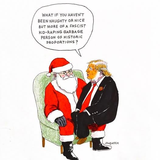 He should be sat on Satan’s knee, not Santa’s.