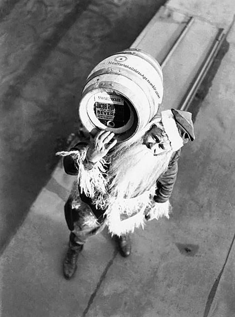 A man in a Santa costume carrying a keg of beer during prohibition to someone who had been good all year, December, 1932 by HelloSlowly