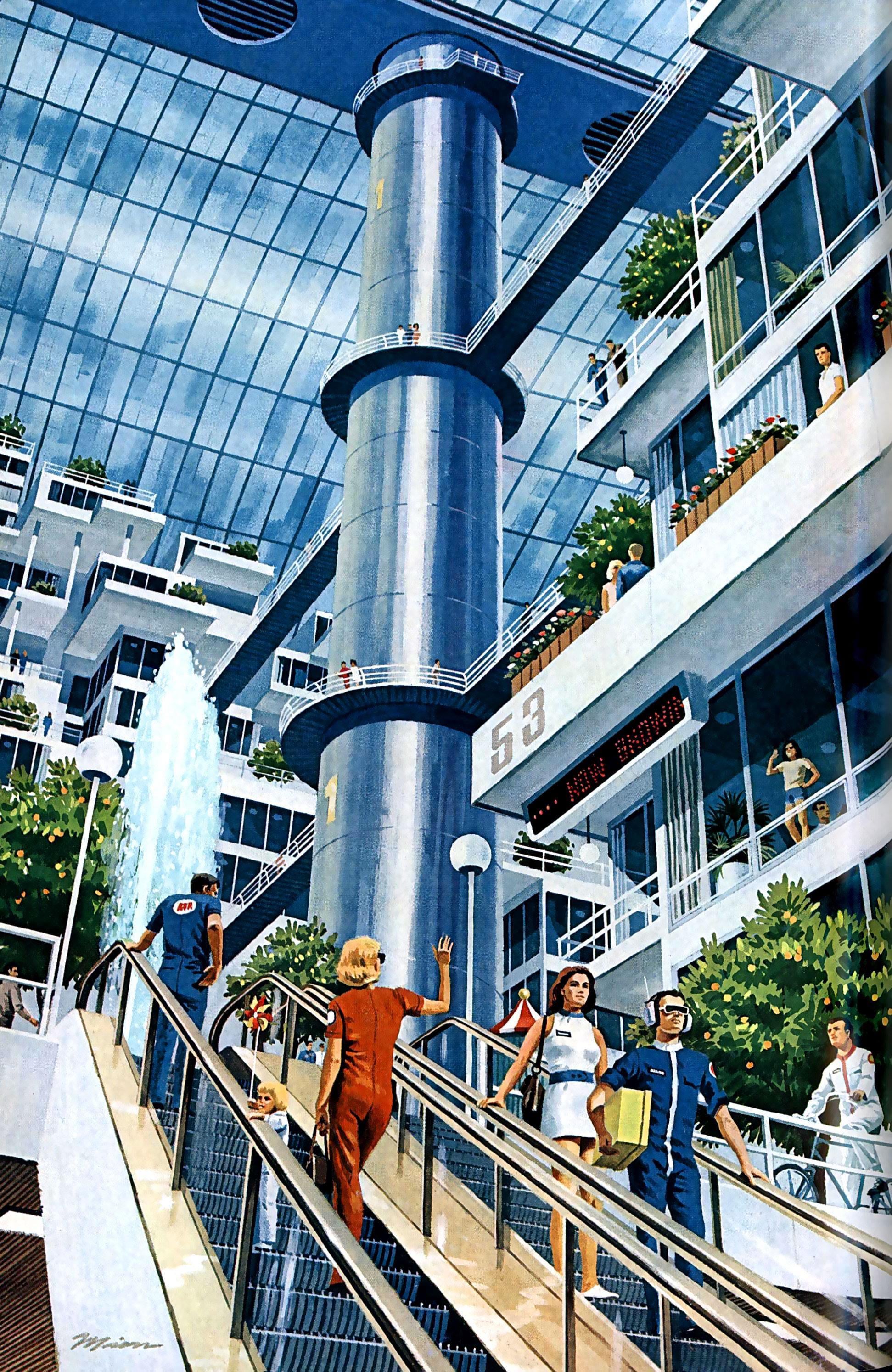 “Main Street, Hometown, Cosmos.” Inside a space colony in the year 2026, illustrated by Pierre Mion for an Isaac Asimov article in National Geographic (July 1976)